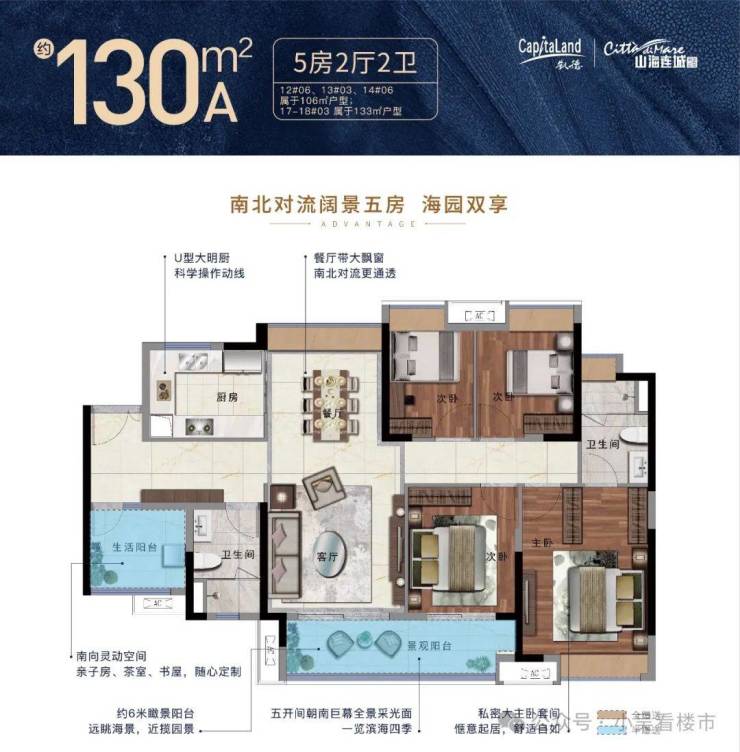 建面130平A户型五房两卫,南北对流,总价250-280万左右。