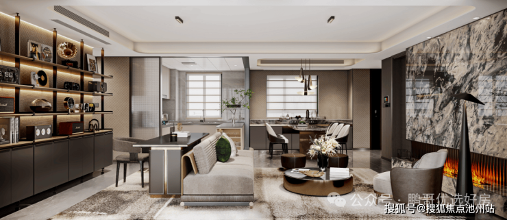 》半开放式厨房,可开合移门+互动岛台,增加厨房的社交性