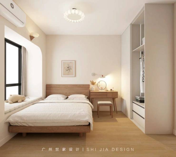 主卧延续简洁的原木风格,整体氛围温和放松,营造舒适平和的睡眠环境。