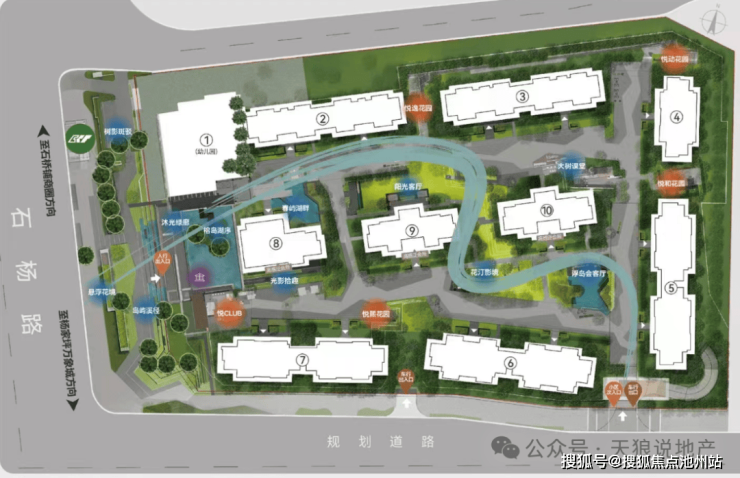 在这个独立的场景里,再通过南北朝向+板式结构建筑排布,让光照、通风、视野都实现了最优解;