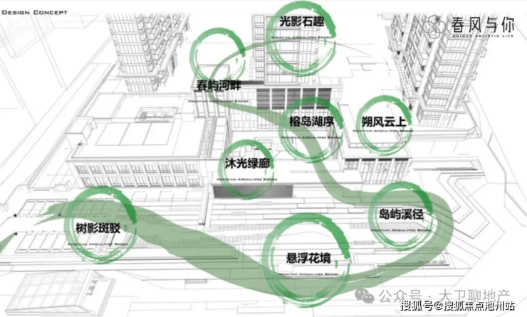 采用的手法,是将部分楼栋串连整合,与景观巧妙链接,形成无界式「泛会所」空间。