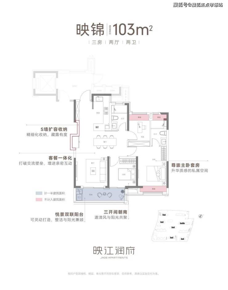 建筑面积约103㎡三房两厅两卫,不失为改善家庭的首选。其中边套户型,映江润府的主卧套房做了 270°环幕飘窗,实现无与伦比的采光通风和视野享受,类比于千万级豪宅的体验!