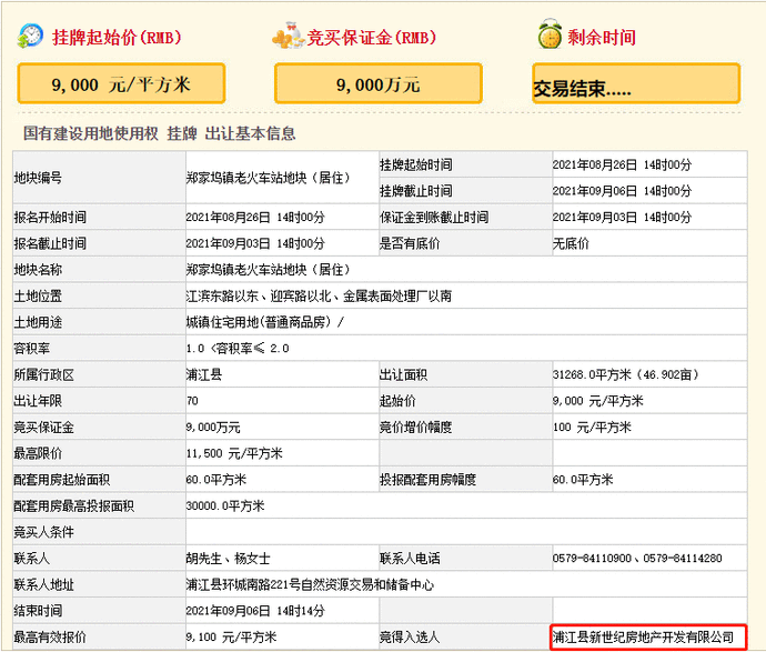 9月6日下午,浦江县郑家坞镇老火车站地块(江滨东路以东、迎宾路以北、金属表面处理厂以南)成功出让,经过2轮出价,浦江县新世纪房地产开发有限公司(浦江县建设集团)以总价28454万元成功竞得,溢价率1.1%,成交楼面价约4550元/㎡。
