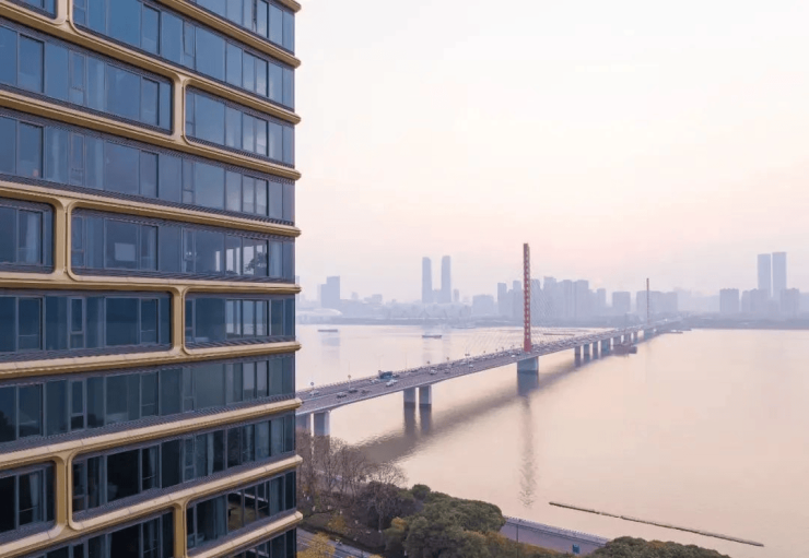 由line+建筑事务所孟凡浩(亚洲建筑师协会金奖得主)主持设计,提取钱塘江“潮涌”动态元素,以金色铝板曲面线条与大尺度玻璃幕墙结合,形成流动韵律。外立面经十余次实体挂样测试,确保不同光线下的视觉效果。