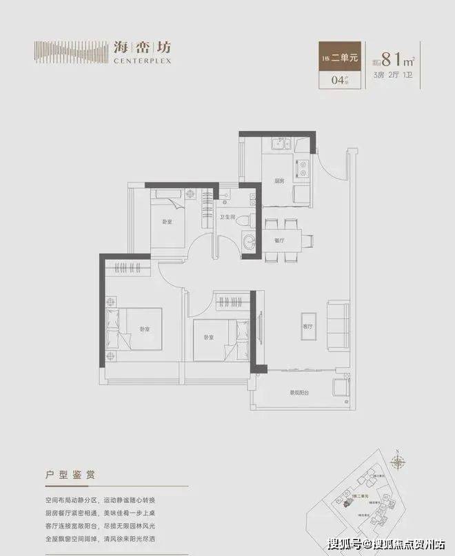 【81㎡3房1卫】:目前在售的主力户型,规规矩矩的竖厅格局,餐客厅阳台一体,三个房间都带飘窗。