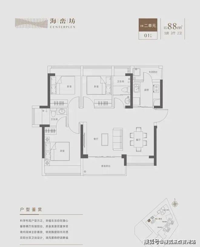 【88㎡3房2卫】:横厅格局,餐客厅阳台一体,空间利用率高,全屋飘窗设计,通风采光不错。