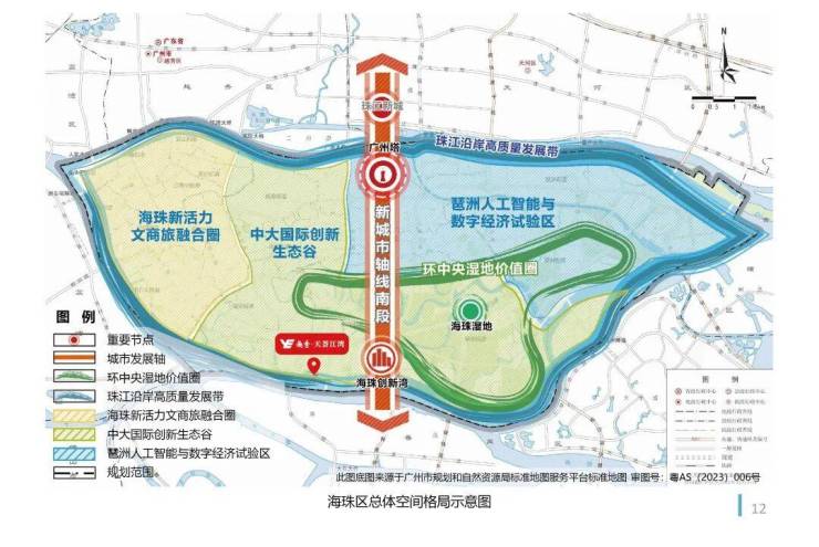 为指引全区未来国土空间发展方向,实现高质量发展和高标准建设,海珠区编制了《广州市海珠区国土空间总体规划(2021-2035年)》,目前已形成规划草案。一轴引领、两环带动、三区支撑”的城市空间格局,构建更具竞争力的数字创新城区。