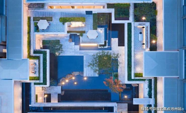 下沉庭院采用大面积静水面结合造型树的方式打造,同时局部设置叠级分台的方式增加空间的层次。
