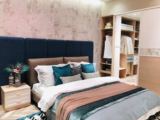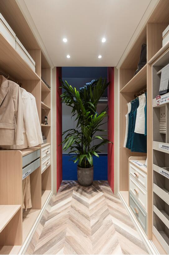 整个卧室空间从飘窗柜、床、床头柜从左至右一体化设计,步入式衣帽间利用男女分区互不影响,将长衣、短衣、小物件等独立分开,不常用物品置于顶柜,更符合家庭生活动线。