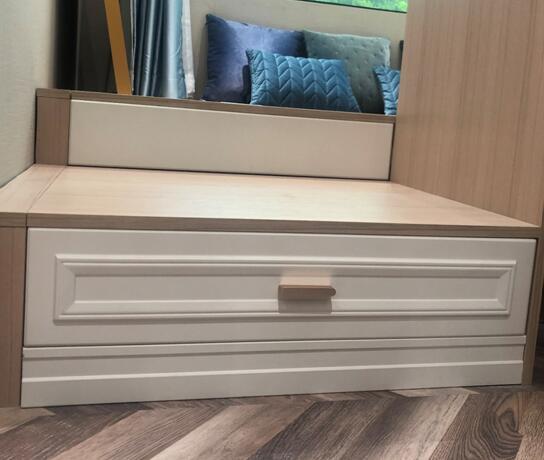 在女士衣柜上增设滑动式梳妆镜,背后可分区隐藏收纳香水、首饰、化妆品等物品,化妆穿衣一次解决,出门更轻松便捷。