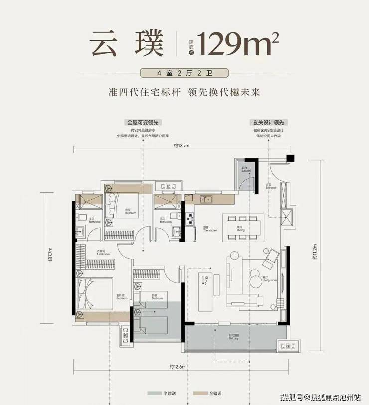 云璞户型建面约129平四室两厅两卫:此户型位于边户,南北通透,也是非常常见的边户,不过就129平这个面积段能做成四房,也是比功能性发挥到了极致!