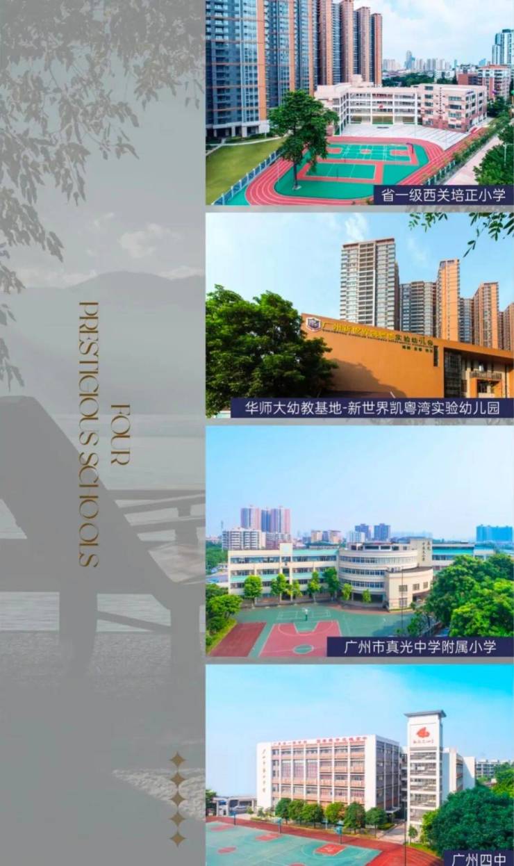 全龄教育体系:项目配建华师大幼教基地凯粤湾实验幼儿园,引入省一级西关培正小学凯粤湾校区,对口广州四中新世界校区(公立完全中学),覆盖2-16岁全龄段教育。