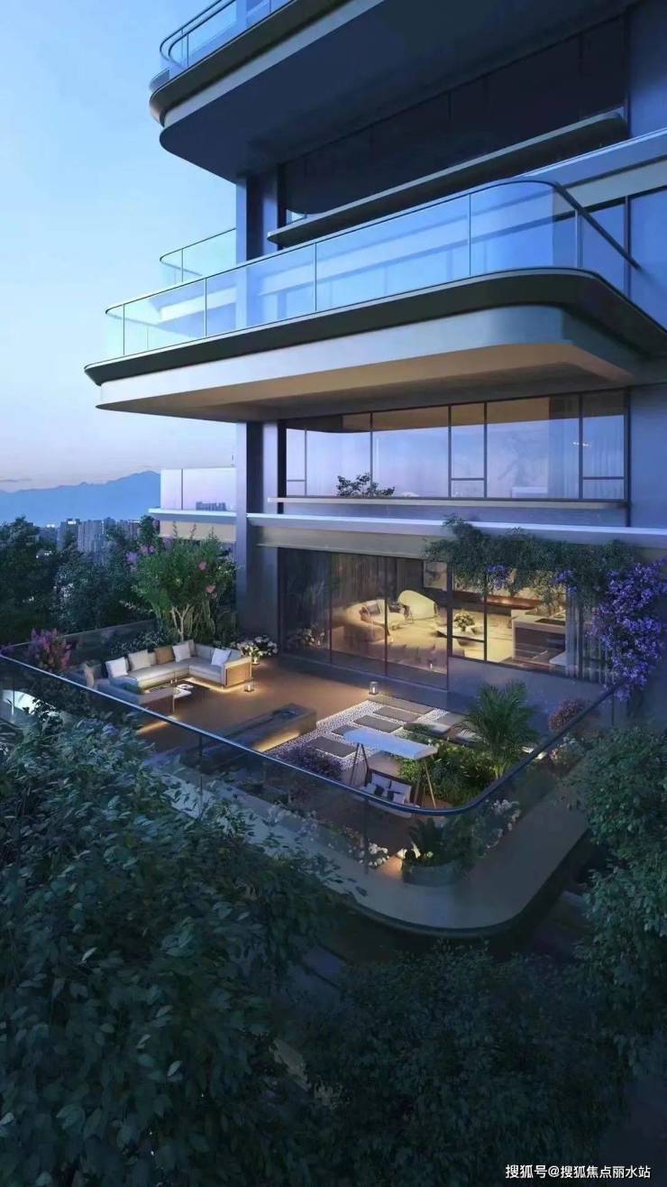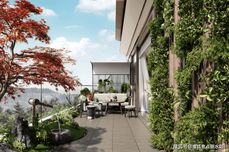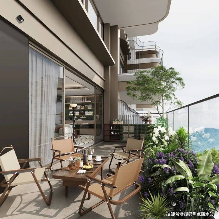 区别于传统阳台进深约1.5m,项目露台进深最大约3.2m,尺度升级的同时形成约270°观景视野,营造出庭院深深的空中花园体验。