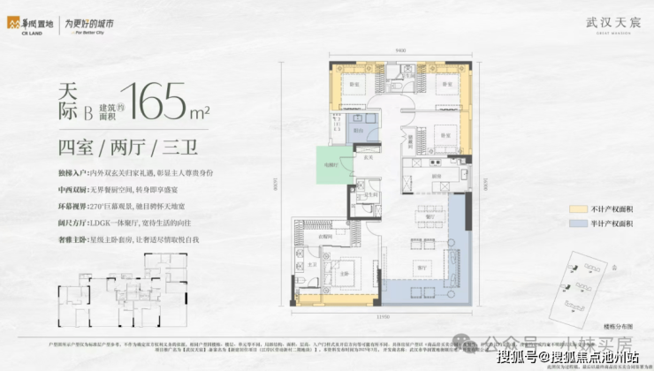 2、4号楼小高层就都是165平的户型了,也有两种布局。因为本身公摊更低,加上拓展面积,165平户型得房率可以达到约100%,标准的负公摊。