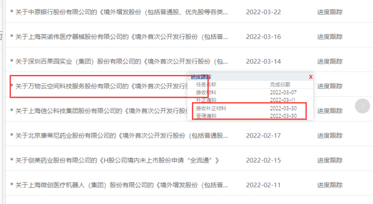 焦点财经讯 3月30日,据证监会官网显示,证监会公布万物云空间科技服务股份有限公司的《境外首次公开发行股份(包括普通股、优先股等各类股票及股票的派生形式)审批》进度,目前进度已为“接受补正材料”及“受理通知”阶段。