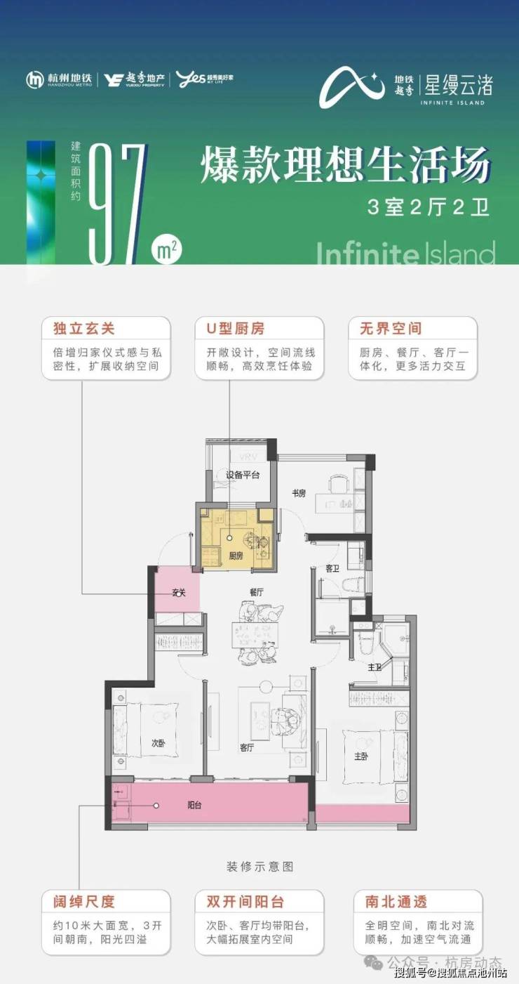 建面约97㎡起步户型,三房两厅两卫格局,南向三开间,次卧与客厅的阳台相连,打造大尺度的双联阳台,还有很大的亮点就是玄关设计,可以很好地护好后期业主的隐私。