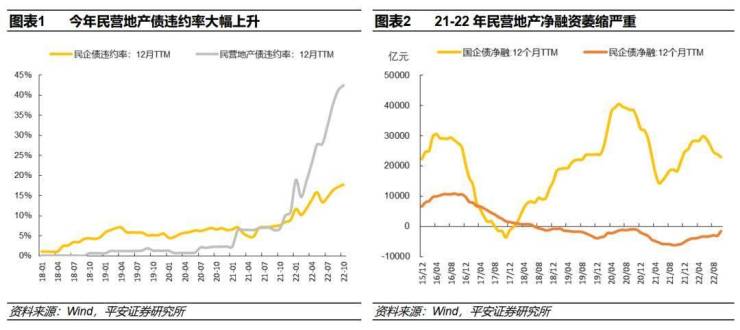 产生背景:在短期和长期因素的共同影响下,21年百强房企销售下降3.5%,而20年是12.4%,今年1-10月更是累计同比下降44%,而21年-22年上半年地产融资政策也持续偏紧,于是地产企业经营和融资现金流都恶化。20-22年民营地产净融资分别是-186.6亿元、-1752.3亿元和-1207.61亿元,同期国营地产债净融资是334.3亿元、132.6亿元和1240亿元。在这个背景下,21年和22年1-10月分别新增14个和45个民营房企债券违约主体,在同期违约主体中分别占比28%和71%,而14-20年累计也只有11个民营房企违约主体。20-22年民营房企债券违约率分别是2.3%、10.9%和42.5%,同期民企债违约率分别是6.5%、9.0%和17.8%。