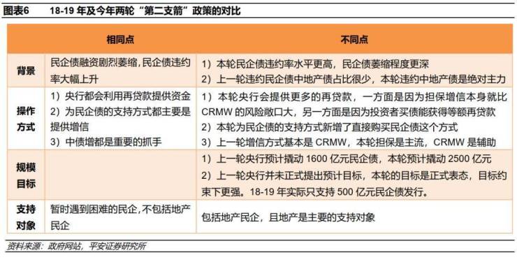 落地力度如何? 与上一轮相比,本轮政策力度预计会明显超过18-19年。主要理由有三点:1)本轮的支持目标有2500亿元,明显超过上一轮的1600亿元,而且上一轮目标并未得到官方正式明确,约束性较弱,实际在18-19年也只支持了500亿元,本轮则是目标则是得到正式官宣,约束性更强;2)本轮主要支持房地产民企,当前地产民企债存量规模5800亿元,2500亿元是5800亿元的43%,而上一轮支持的行业有十几个,合计存量规模有1.9万亿,1600亿元只占1.9万亿的8%;3)本轮主要通过担保而非CRMW进行增信,而且本轮还会通过直接购买的方式支持民企债,因此本轮央行为民企提供的增信力度明显超过上一轮,央行提供的再贷款规模也会明显超过上一轮。