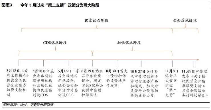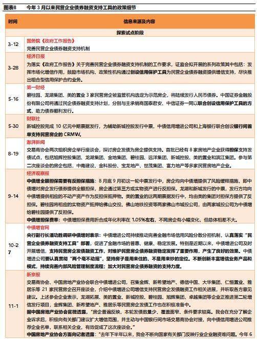 产生过程:分成两个阶段,今年两会到11月是探索试点阶段,11月8日协会官宣后就是全面落地阶段。探索试点阶段又分成两个子阶段,今年《政府工作报告》提出完善民营企业债券融资支持机制,5月证监会指导证金公司、交易商协会指导中债增分别在交易所和银行间创设了支持民营房企的CDS和CRMW,但信用缓释工具对民企债的额度和时限都覆盖有限,因此增信效果较弱,无法应对民营地产愈演愈烈的违约。于是在8月,协会两次举行民营房企座谈会,确定首批8家企业获得中债增担保发债,到10月已经有累计68亿元民营地产债得以通过中债增担保而完成发行。11月8日,在总结试点的基础上,交易商协会宣布在央行支持下继续推进并扩大扩大民营企业债券融资支持工具。11月9日,中债增发布《关于接收民营企业债券融资支持工具房企增信业务材料的通知》,为民营房企开启绿色通道。