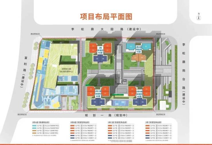 该项目共有住宅4栋,其中商品房1栋,三梯4户45层,安居房共有3栋,均为三梯6户46层。住宅共有896户,其中安居房736户(三房约246套,两房约490套),商品房160户。车位有920个,车位比超过1:1,比较充足。