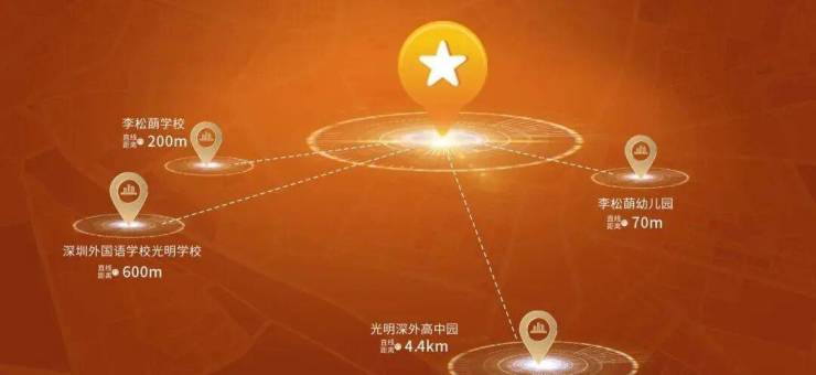 深圳外国语学校光明学校,直线距离约600米,由光明区委区政府重点打造的一所九年一贯制公办学校,委托深圳外国语学校全面管理,办学规模为54班,9月1日新校区落成已开学。
