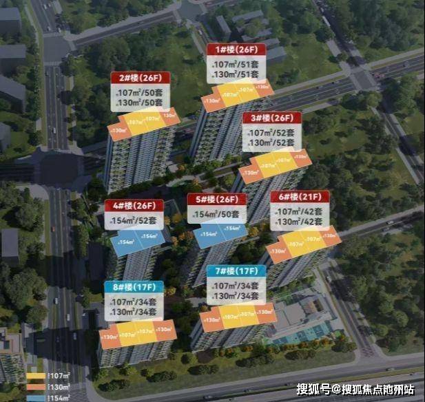 项目没有“高低配”,都是17-26层左右的高层产品。一期整体的楼栋都是正南北朝向的,除了6/7两栋临高速的楼栋是17层的,其他六栋都是26层的产品(楼栋号均为示意,并非真实楼栋)。