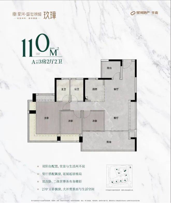 110㎡三房:横厅设计,6米跑道阳台,客餐厅面宽4米,改善客群优选。