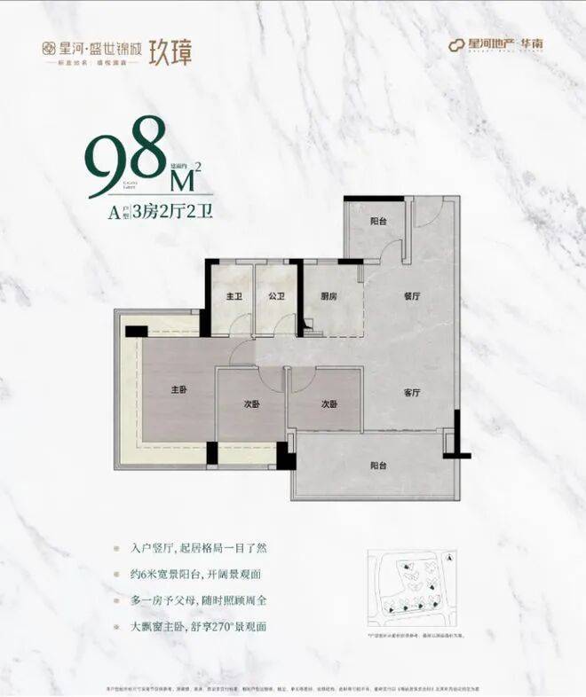 98㎡三房:南向双阳台,主卧270°飘窗,总价300万起,适合刚需家庭。