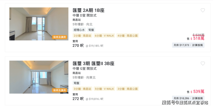 现在这个楼盘楼龄在5年左右,香港近两年楼价下跌的情况下,见目前地产放售的一些二手开放式笋盘可以低至518万。