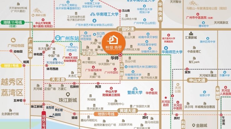 悦珵·翡翠坐落于广州市天河区五山路263号,地处天河北CBD与五山科教综合区双核心交汇点,周边汇聚世界500强企业总部、金融机构及华南理工大学、华南师范大学等985/211高校。项目300米直达地铁3/10/11号线华师站,2站到广州东站、4站至珠江新城、5站抵广州塔,广园快速、华南快速环伺,15分钟直达大湾区核心城市。
