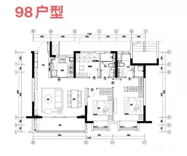 98㎡A户型3-2-2,5.4米横厅