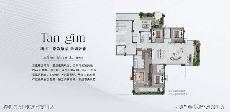 保利·天珺主力户型面积约187平,天字系+第四代住宅+纯大户型,高级别的产品定位,加上“空中庭院”新颖的产品设计,可以看出保利·天珺项目定位高端,面向高端改善市场