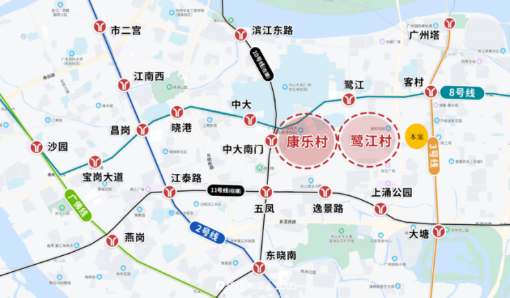项目紧邻城市主干道广州大道南,自驾出行可快速通达珠江新城、琶洲、体育西等核心商圈。公共交通方面,周边汇聚3号线、8号线及在建的10号线、11号线,四条地铁线两两交汇形成井字形路网。地铁站鹭江、客村等距离约1.5公里,需通过骑行或短途接驳抵达。未来10号线通车后,通勤效率将进一步提升。