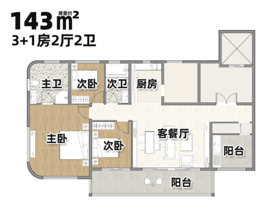 140㎡四房:3.15米层高,电梯直达入户,双联阳台连接客厅与卧室,北瞰广州塔,南向主卧270度观景。