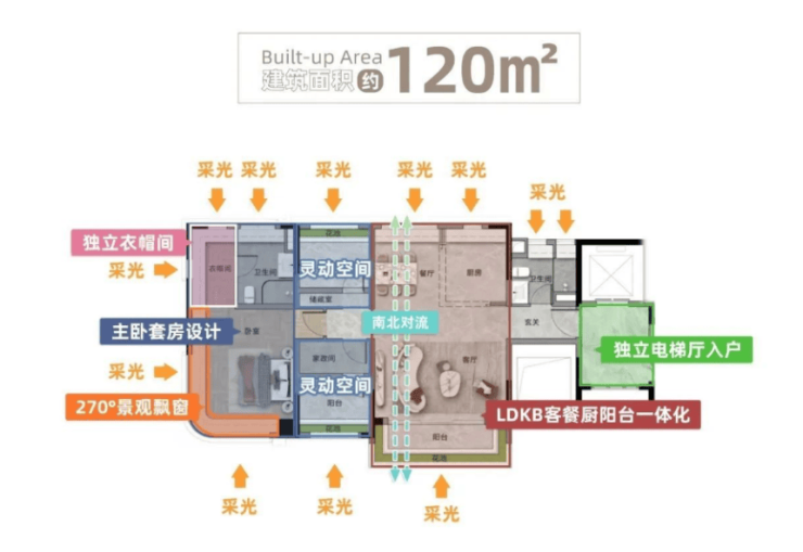 120㎡四房:4.5开间朝南,全屋采光面达16米,南北通透双视野,主卧带独立衣帽间。