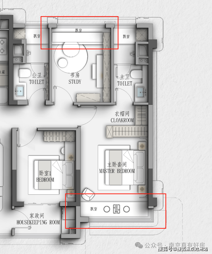 结构上和边户基本一致,区别在于观景露台的位置,中间户露台连着主卧相连,卧室套房的舒适度更高。