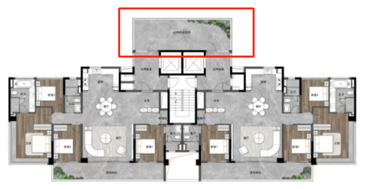 背后的精髓更在于,以“10%不计容公共空间”,创造主城平层住宅前所未有的“南北双庭院体系”。