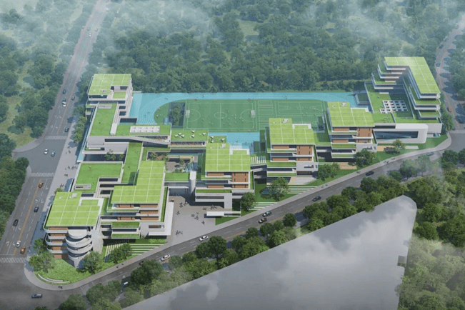 新建54班九年一贯制学校,提供2520个学位,包含初中部、小学部、体育馆、教师宿舍、图书馆与报告厅、餐厅等。