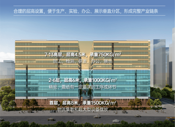 普通厂房二层以上普通层高不足,空间规划受限。而光明科兴科学园的高标厂房,首层层高高达8米,2-6层层高6米,7-13层层高4.5米,完美满足企业工业上楼的需求。