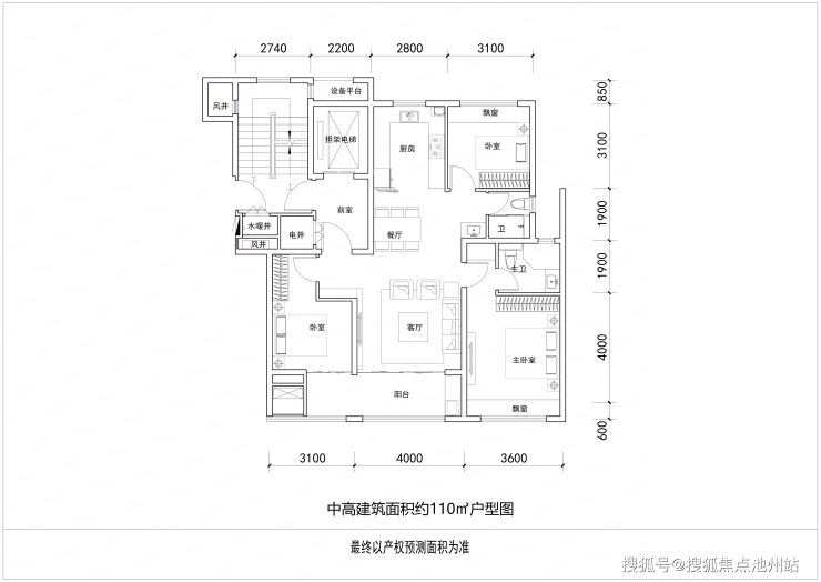 中高层(17F)建面约110㎡户型(套内实用得房率超84%,不含南向空调机位和电梯前室的灵活利用)