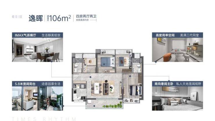 建面约 106㎡四房户型,满足家庭成员较多家庭的居住需求,房间数量充足,能提供独立的卧室与活动空间。布局方正,动静分区合理,保证居住舒适度。宽敞的客厅与阳台,可俯瞰社区园林景观,提升居住品质