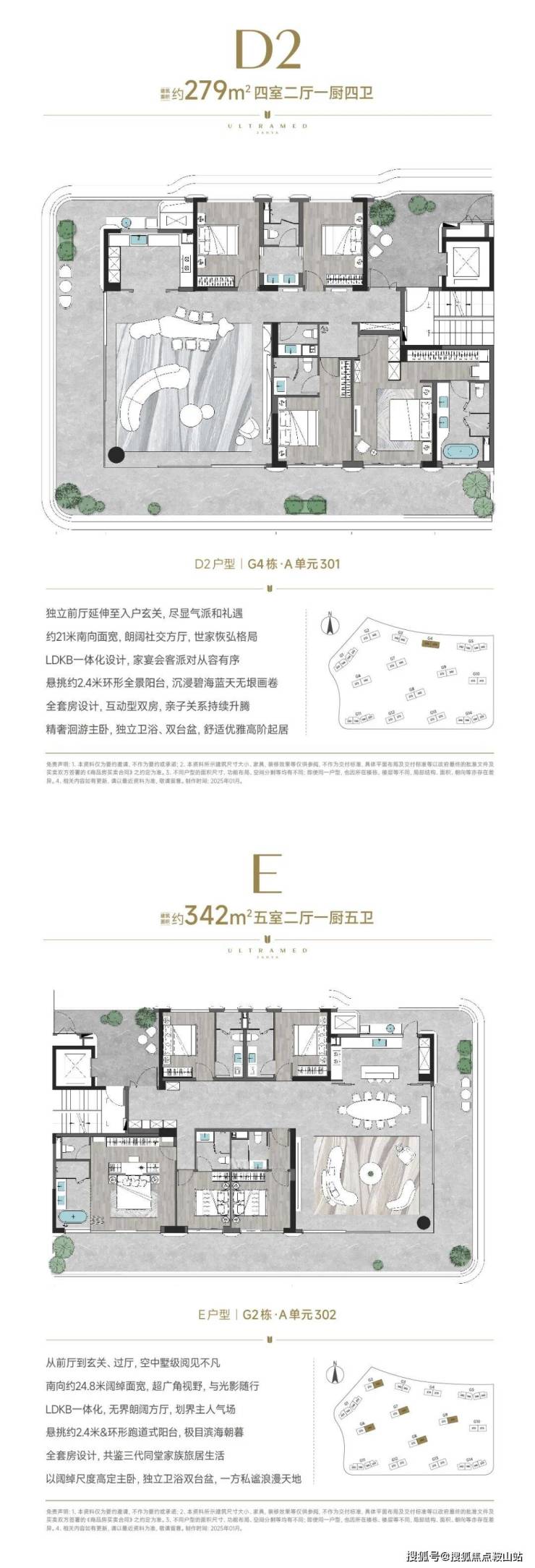 建面约 342㎡的五室两厅五卫户型,由香港郑中设计 (CCD) 操刀,采用 “皇家游轮式空间” 设计概念。五套房设计,主卧与紧邻次套房可灵活打通,形成近 50㎡的 “总统套房” 级奢华空间。端厅及 270°U 型阳台设计,搭配 LDKB 一体化设计,客餐厅尺度接近 75㎡,外接超阔绰阳台,视野开阔,能轻松胜任各种聚会和商务洽谈场景。