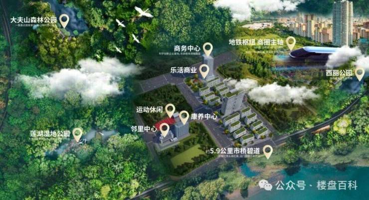 休闲——自带约2650㎡邻里中心、约800㎡运动休闲;周边有约9000亩大夫山、约7290亩滴水岩森林公园、约1200亩莲湖生态湿地公园等5A森林公园;