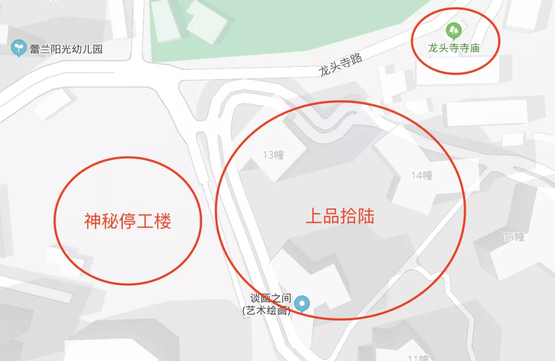 从地图上来看,上品拾陆的西侧是这栋神秘楼,而东北侧是龙头寺寺庙。