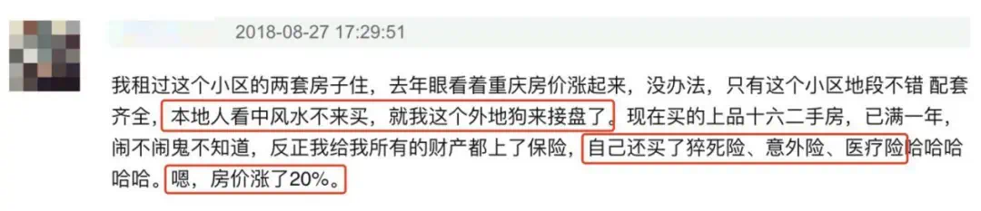 当然,也有人眼看房价涨了,急了!最后买了上品拾陆的房子,自嘲是“外地狗”来接盘。同时,答主还豁达地表示自己买了猝死险、意外险等一大堆保险,实在是让人哭笑不得……