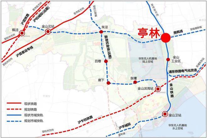 与奉贤、松江两区是邻居,到城央的直线距离,可以类比松江新城与奉贤新城。尤其是金山亭林,作为更靠近城央的地区之一,更有着先天的地理优势。