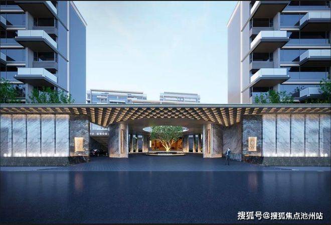 大门顶部采用全定制化造型立体铝板,两侧立柱及酒店式环岛落客厅大面铺陈