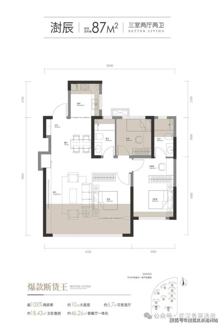 87平户型客厅宽度大概在3.4-3.6米(包括墙体),客厅处设置了凹槽可放冰箱。朝北次卧,整个次卧半赠送(把赠送做到了极致)
