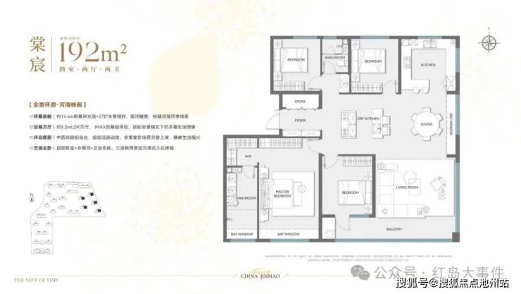 192㎡终极改善户型,四房两厅两卫的设计,南北双套房,客厅拥有270度景观视野,整个胶州湾的美景尽收眼底。