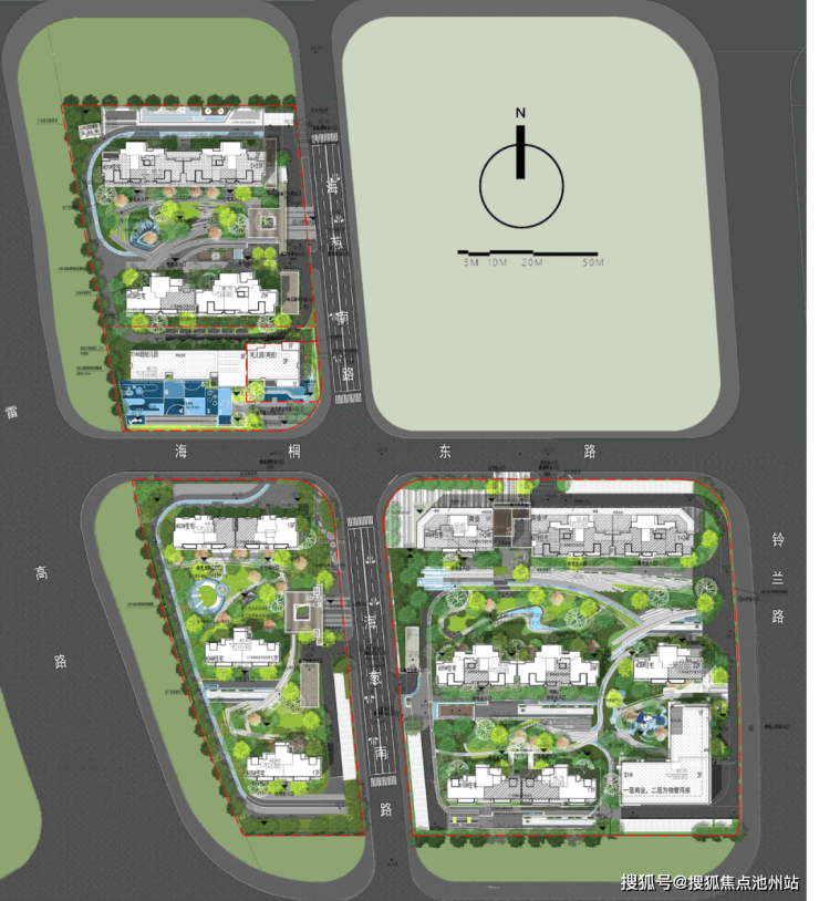 项目内部两条时尚艺术商业街区、四个有气质的华府门楼、三条有诗意的林间运动环、三处有温度的全龄健身花园、三处有故事的儿童乐园、贯穿整个场地的无界公园式理想住区。